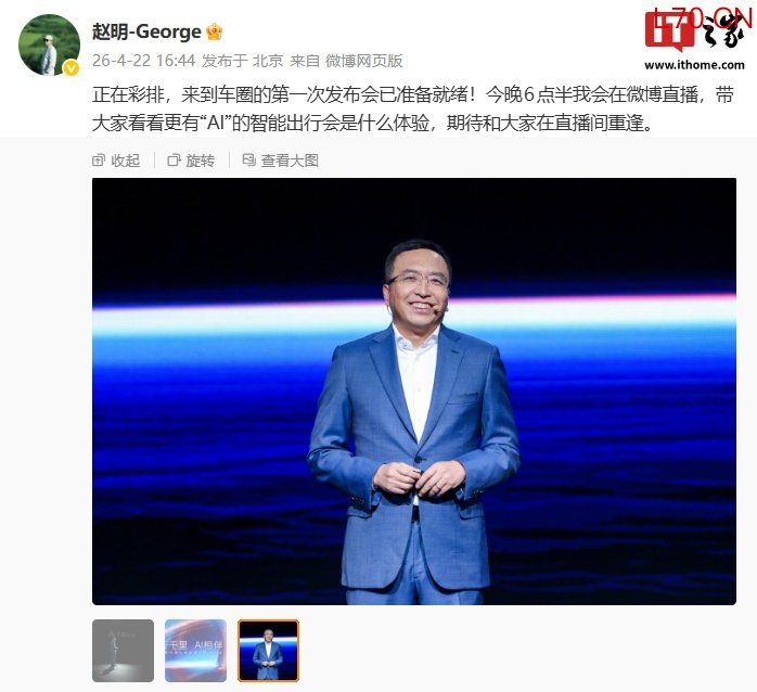 赵明车圈首秀:千里科技 AI 战略暨产品发布会今晚 7 点举行
