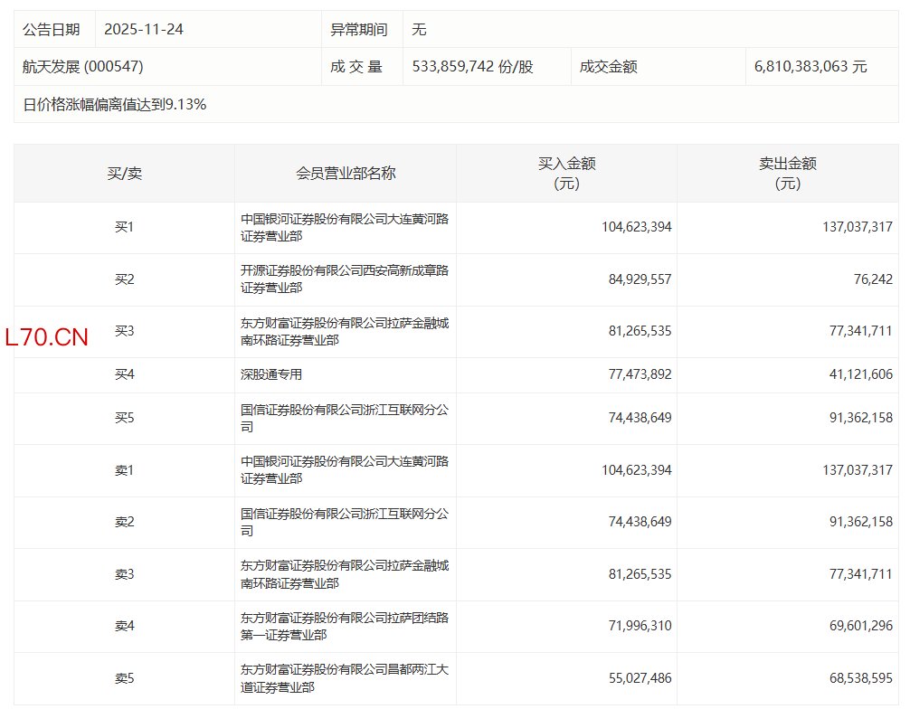 航天发展今日涨10.00% 陈小群席位买入1.05亿元卖出1.37亿元