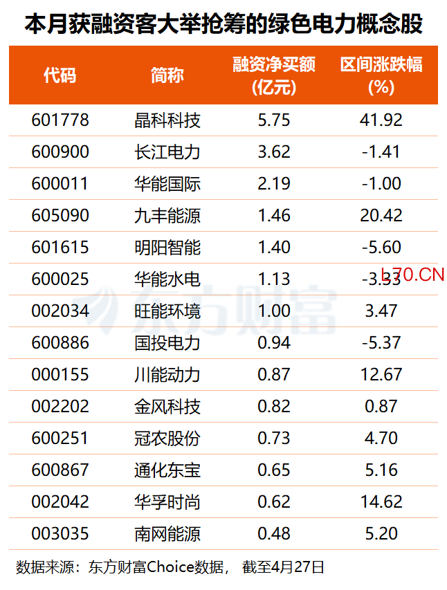 资金层面,东方财富Choice数据显示,4月以来,共有27只绿色电力概念股获得超千万元融资净买入,其中,晶科科技获杠杆资金加仓5.75亿元,长江电力获融资客抢筹3.62亿元,华能国际亦获加仓2.19亿元,九丰能源、明阳智能、华能水电融资净买额均在1亿元以上。