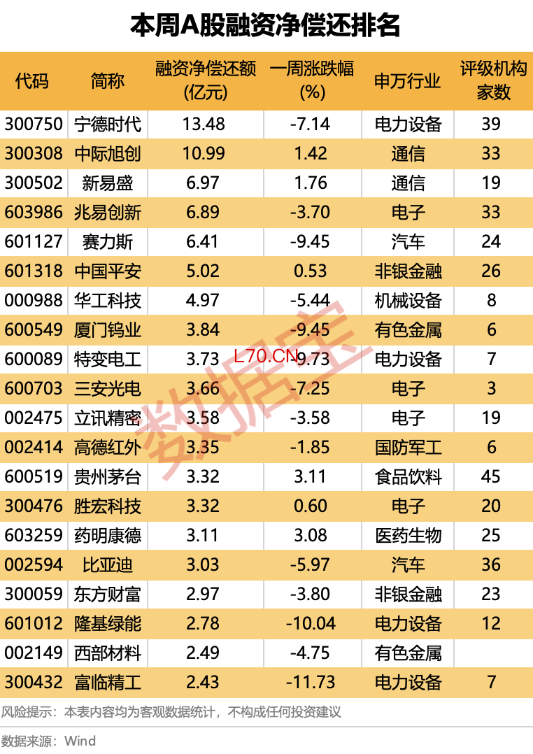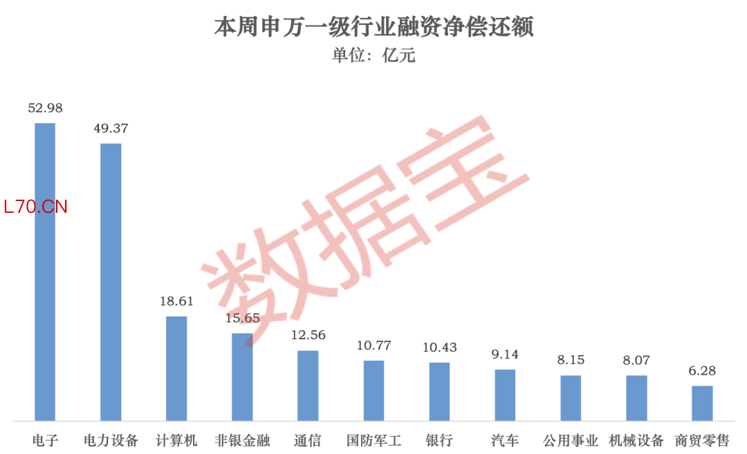 分行业来看,电子、电力设备行业居前,融资净偿还额分别为52.98亿元、49.37亿元;计算机、非银金融、通信、国防军工、银行行业随后,融资净偿还额均在10亿元以上。